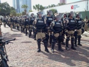 During the Republication National Convention in Tampa, nearly 100 police in body armor and riot gear swarmed in after a large group of anarchists confronted a handful of right-wing protesters from the Westboro Baptist church.